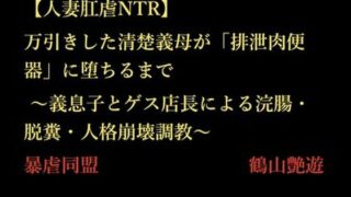キャラクター紹介■ 村上 姫菜(むらかみ ひな) / 41歳 商社役員の夫を持つ、気品溢れる専業主婦。手入れの行き届いた美貌と、年齢を感じさせない極上の肉体を持つ。 夫の単身赴任と義息子との距離感に孤独を感じ、スリルを求めて万引きをしてしまう。それを弱みに握られ、排泄器官としての尊厳を徹底的に破壊されることに。■ 村上 碧(むらかみ あお) 姫菜の義理の息子。爽やかなスポーツマンの大学生だが、裏ではスーパーでアルバイトをしている。 表向きは好青年だが、内面には義母への歪んだ性欲と支配欲を隠し持っていた。姫菜の調教における実質的な支配者となり、冷酷に「母親」を「便器」へと堕としていく。■ 鬼山 権左衛門(おにやま ごんざえもん) スーパー『オニヤマ』のオーナー店長。醜悪な外見と腐った性根を持つ。 金持ちの人妻をターゲットにしており、姫菜の万引き現場を押さえ、調教を開始する。汚物と加虐を好む変態。■ 山本 杵築(やまもと きづき) 通称「筋肉ダルマ」。鬼山が呼んだ暴力担当のゴロつき。 常人離れした巨根と怪力を持ち、姫菜の狭い未開拓の肛門を物理的に破壊・拡張する役割を担う。■ 村上 誠(むらかみ まこと) / 52歳 姫菜の夫。エリート商社マン。妻を愛しているが、サプライズで帰国した自宅で、変わり果てた妻の姿を目撃することになる。商品紹介文(あらすじ・見どころ)高貴な人妻が「排泄する家畜」へと堕ちていく、背徳と汚辱のNTR堕落劇。 大量の浣腸液、極太バイブ、そして公衆の面前での脱糞ショー。 義理の息子に見下され、ゴロつきに穴を拡張され、最後は夫の目の前で――。【ストーリー】 商社役員の夫を持ち、何不自由ない生活を送る人妻・村上姫菜。 しかし、夫の不在と孤独感から、彼女は高級スーパーで万引きに手を染めてしまう。 それを店長の鬼山に見つかり、連れ込まれた事務室で待っていたのは、なんと義理の息子・碧だった。 「母さん。あんたの身体で償うんだよ」 弱みを握られた姫菜は、その日から「万引きの償い」として、お尻の穴を使った過酷な洗浄(調教)を受けることになる。【シチュエーション・要素】強●浣腸・限界保持 大量の冷水を注入され、プラグで栓をされたまま長時間放置。極限の便意に耐えさせられる苦悶。脱糞・排泄管理 我慢の限界を超え、義息子の目の前や公衆トイレ、スーパーの調理台などでの強●排泄。スカトロ・食糞 自ら撒き散らした汚物を掃除させられ、舐め取らされる屈辱。肛門拡張・フィスト 未開拓だった菊門を、ガラス器具、野菜、極太ディルド、そして巨根で無慈悲に拡張。閉じない穴(ガバガバ)への改造。公開羞恥・野外露出 体内にバイブを仕込まれたままの買い物、公衆トイレでの土下座懇願。人格崩壊・メス豚化 「私は肉便器です」と言わされる洗脳。羞恥心はやがて快楽へと変わり、最後は夫の前で自ら汚物を垂れ流し悦ぶ廃人へ。※本作品にはスカトロジー、浣腸、ハードな身体毀損表現が含まれます。苦手な方はご注意ください。※本作は、執筆および校正のプロセスにおいて、AIによる表現補助・推敲支援を使用しております。本文約24000字。スマホなどでも読めるPDFスクロール形式。